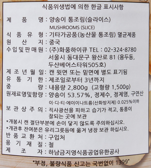 화풍 양송이캔(특편) 2.8kg