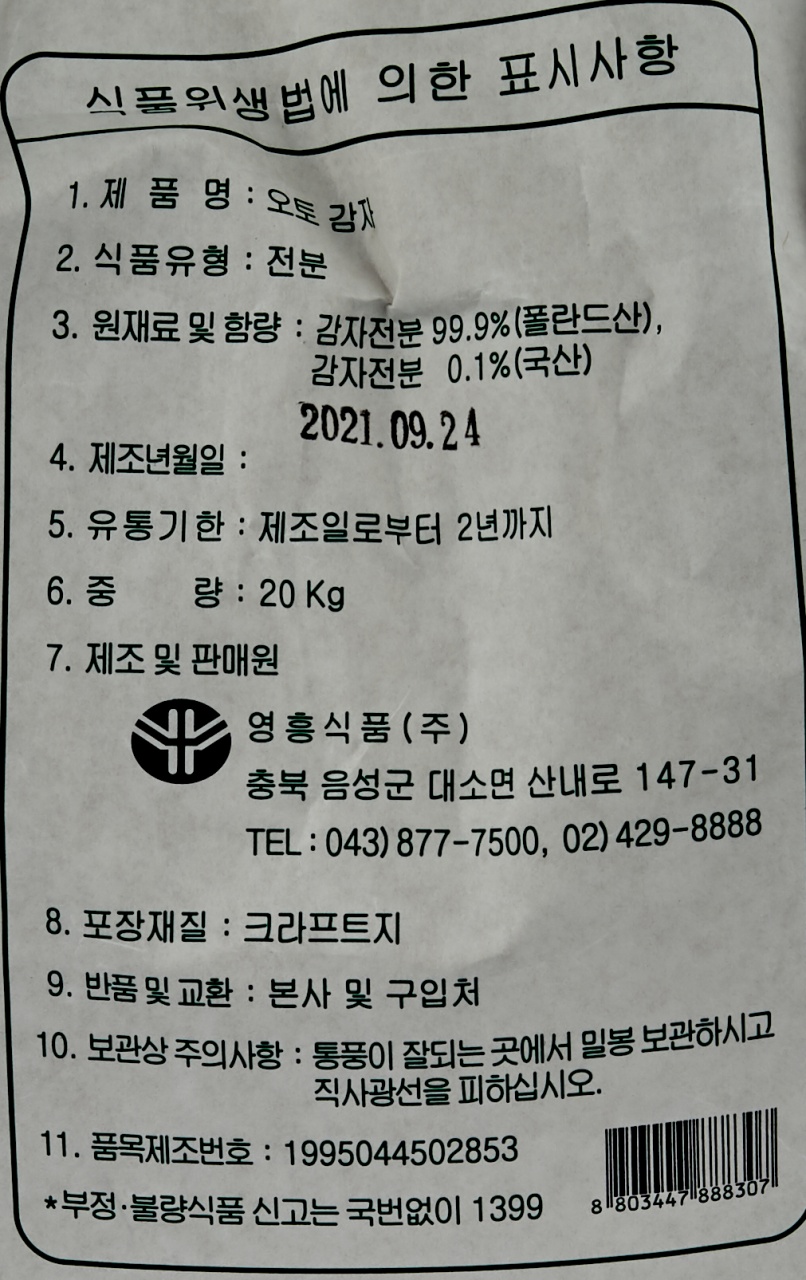 오토 감자전분(100%) 20kg