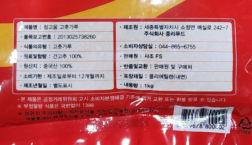 중리 고춧가루(김치용_상_8m_수입) 1kg