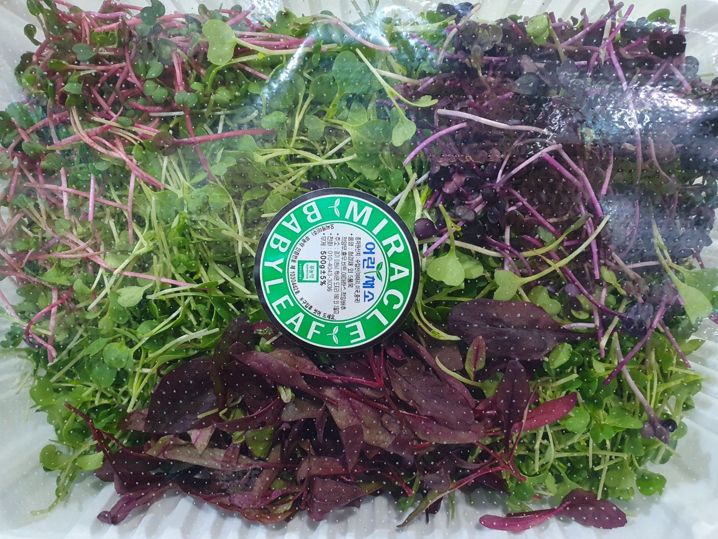 베이비채소 (Baby Greens): 싹이 튼 후 본잎이 1~3장 정도 자란, 성체 채소의 축소판과 같은 어린잎 상태입니다. 우리가 흔히 **'어린잎채소'**라고 부르는 것이 바로 이것입니다.