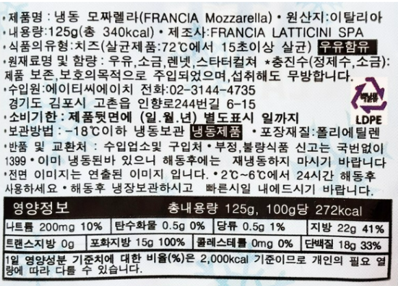 프란시아 모짜렐라 카우치즈 125g