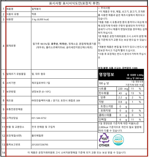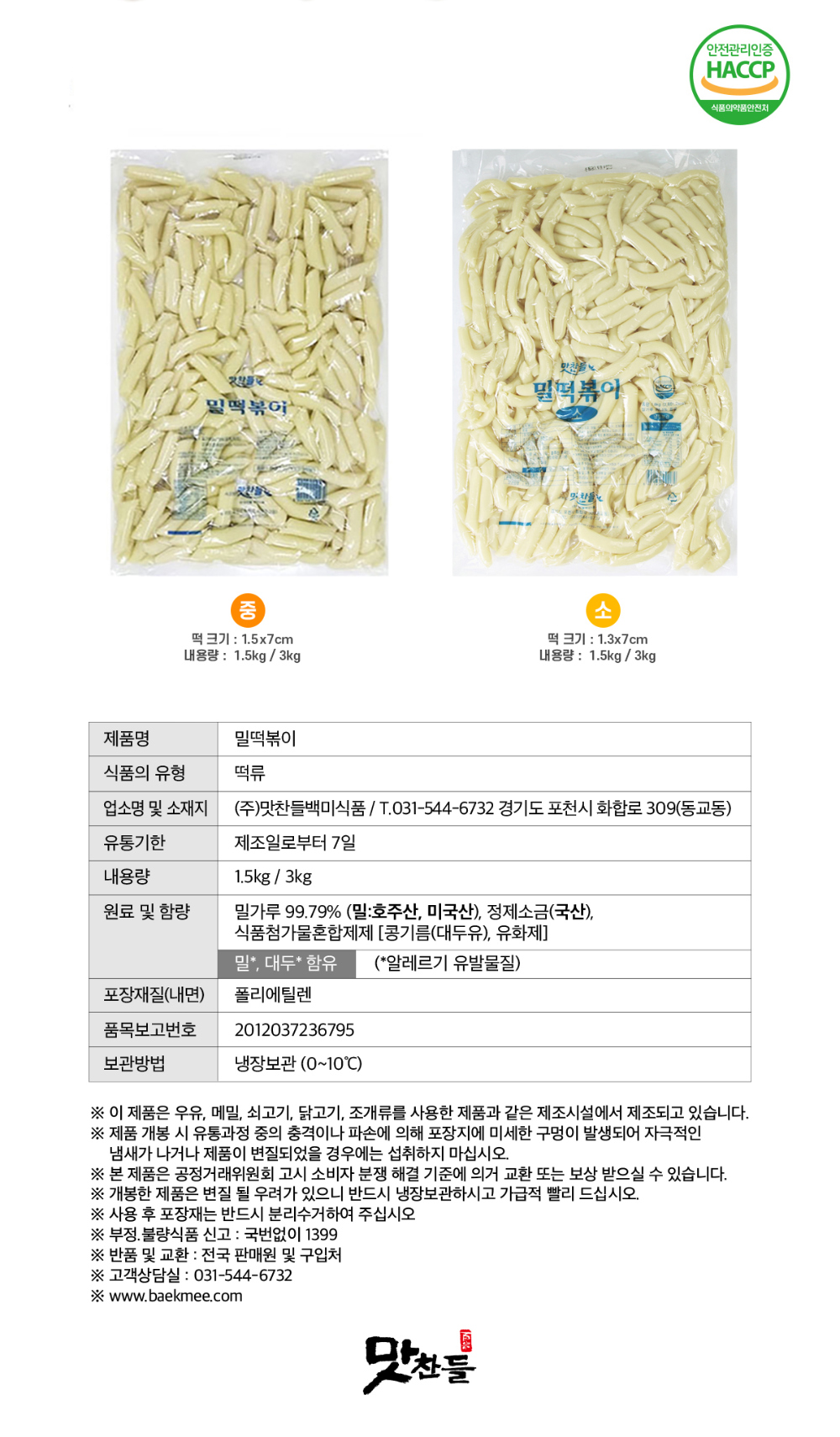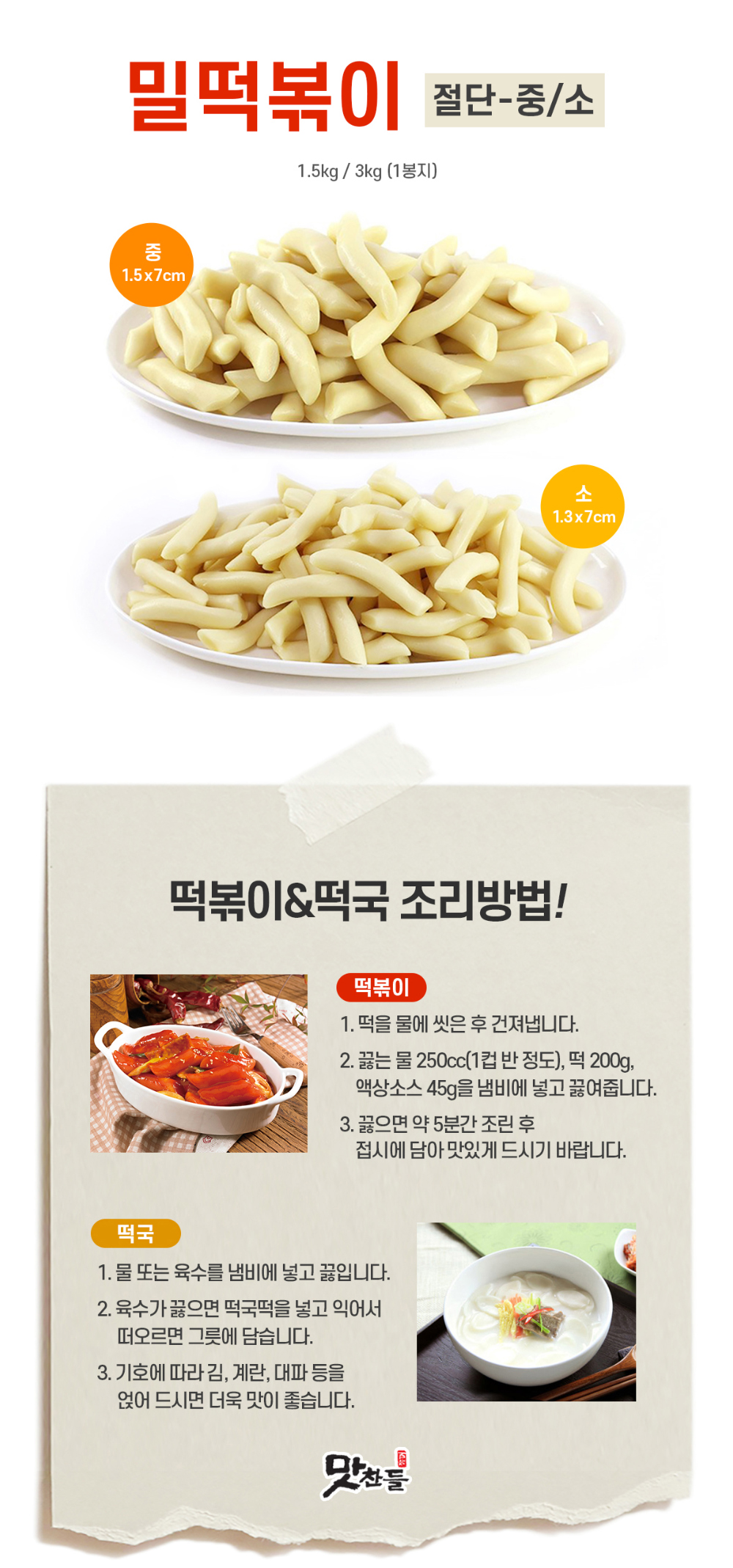 맛찬들 밀떡볶이떡(절단/소) 3kg